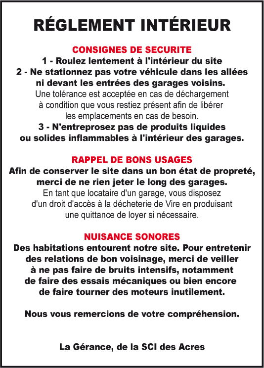 Les box et garages possèdent leur propre réseau d'eaux pluviales. Le site est entretenu 2 fois par an par une société privée qui assure le désherbage, le drainage des caniveaux et le nettoyage des gouttières. Un réglement intérieur est mis en place afin de fixer les règles de location des garages ou des box.